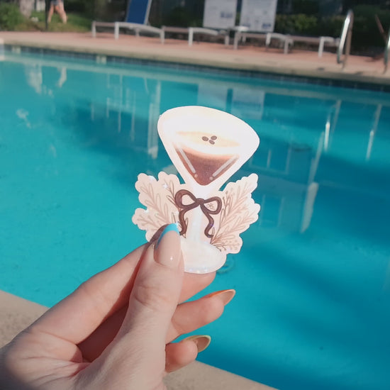 espresso martini sticker | espresso martini gift | gifts for espresso martini lovers | cocktail sticker | coquette cocktail sticker | cocktail and bow sticker | espresso martini and bow sticker | juniper bloom studio |