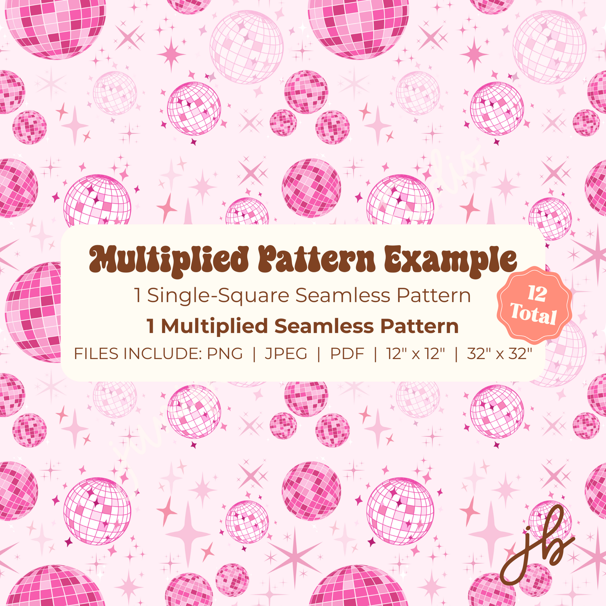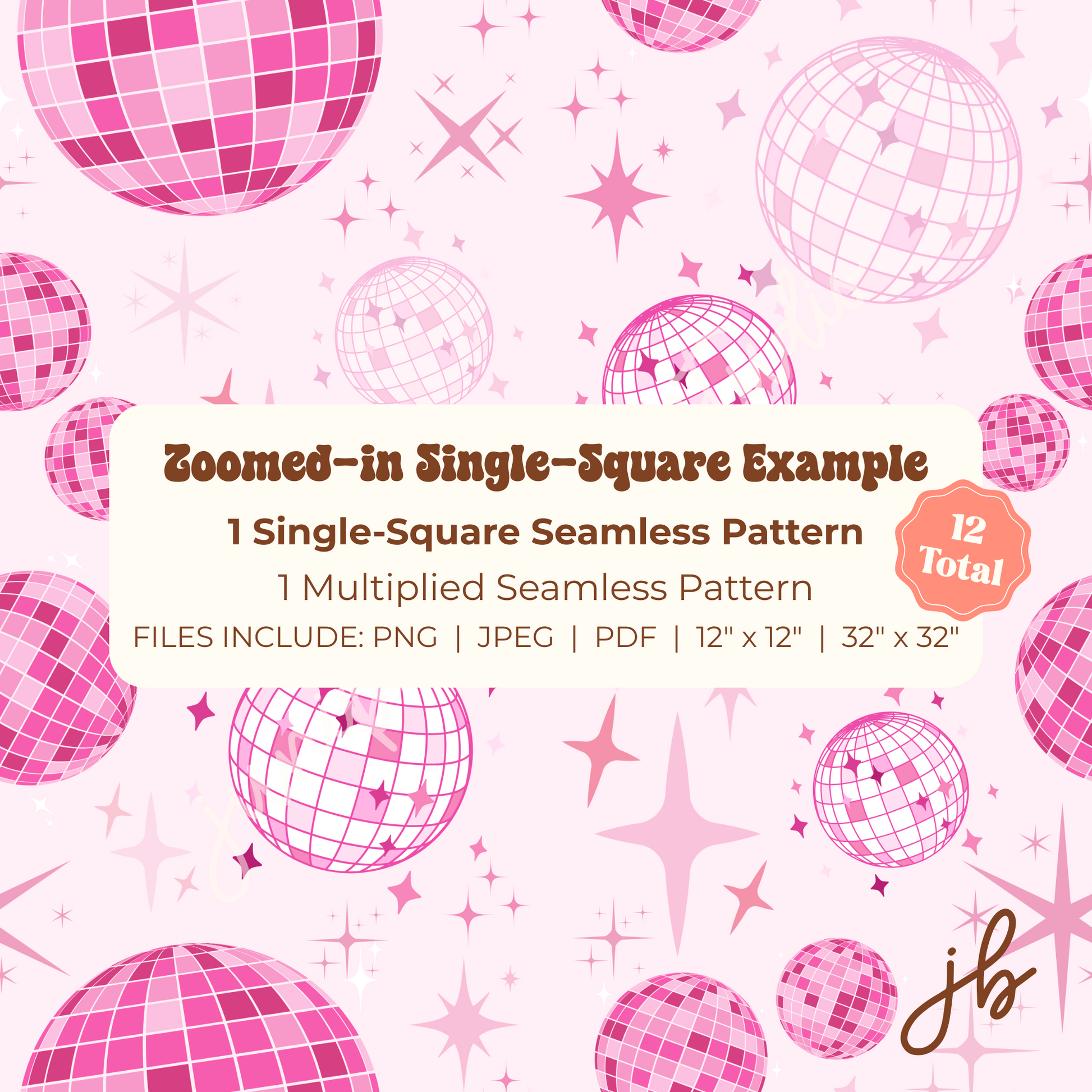 Digital files of a seamless repeating pattern in Disco Pink style. 🪩🕺 Comes in PDF, JPEG, & PNG in both 12in x 12in & 32in x 32in. Can be used as digital pattern as well as on physical products.
